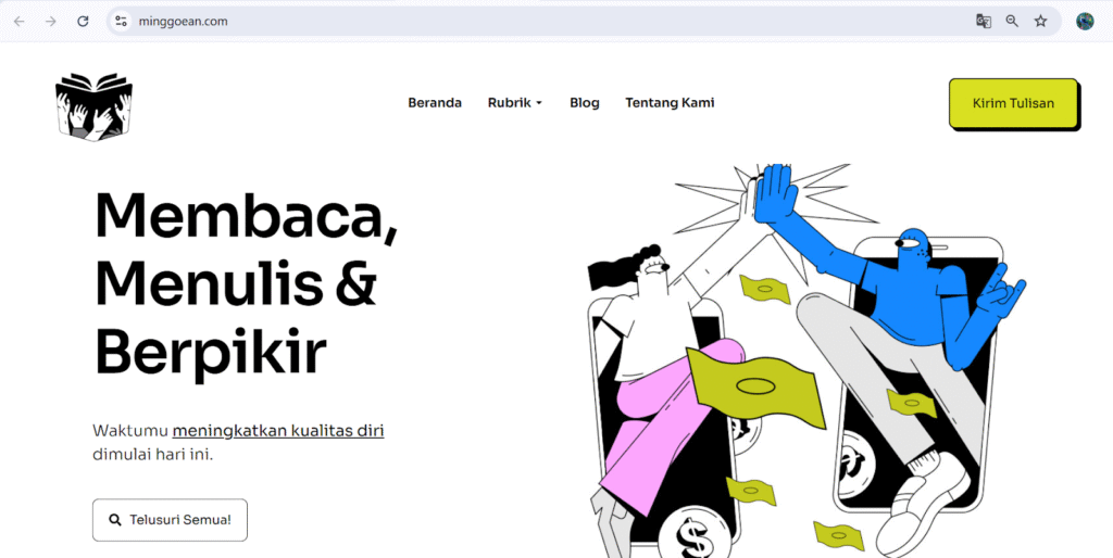 Terakhir, MINGGOEAN.COM bisa jadi pilihan paling tepat untuk belajar nulis, terutama kamu yang baru memutuskan, memulai, dan mencoba konsisten menulis. Soalnya, ruang digital ini menyediakan beberapa rubrik, seperti membaca, menulis, berpikir, dan rupa-rupa imaji.